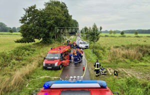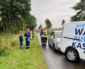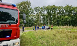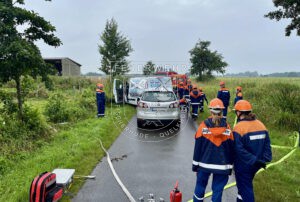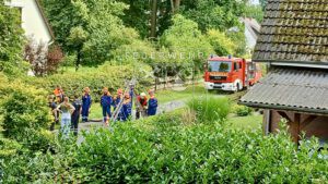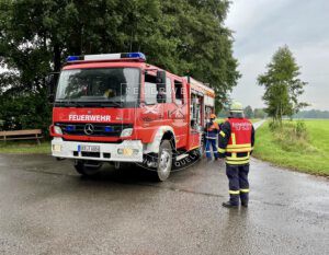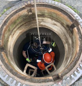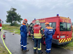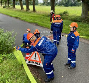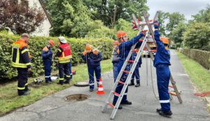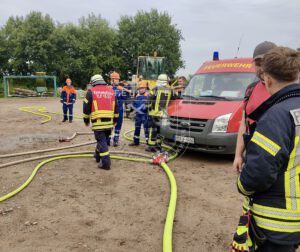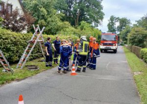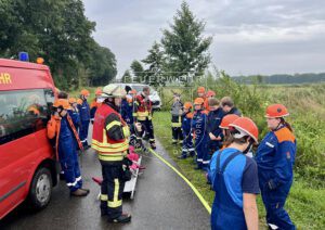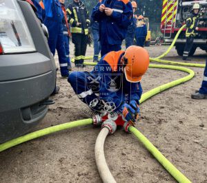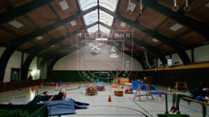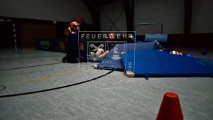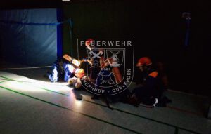 Die ersten Einsätze für unsere Jugendlichen, die auf drei Fahrzeuge aufgeteilt waren, nicht lange auf sich warten. Zuallererst wurde ein Fahrzeug zu einer Schachtrettung alarmiert, kurz darauf die anderen beiden zu einem Fahrzeugbrand sowie einer Notfalltüröffnung. Bei der Schachtrettung war eine Person in einem Straßengulli verunglückt, welche die Jugendlichen mithilfe einer Bockleiter fachgerecht retteten und anschließend erst versorgten. Bei der Notfalltüröffnung war ein Zugang zu der Hütte nicht möglich, sodass die Jugendlichen die Tür zu dieser aufbrechen mussten. Nachdem alle Einsätze abgearbeitet worden sind, rückten die Jugendlichen wieder ein und es wurde gemeinsam gegessen. Am frühen Abend gab es einen Vollalarm: In der Turnhalle der Grundschule war während einer Sportveranstaltung ein fiktiver Brand ausgebrochen und es mussten diverse Personen unter Atemschutz unter erschwerter Sicht gerettet werden. Über verschiedene Zugänge gingen Trupps mit unseren Atemschutzgeräte-Attrappen im Gebäude zur Menschenrettung vor.
