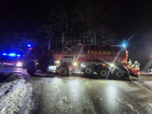 An dem Einsatz war ein Großaufgebot von über 100 Einsatzkräften beteiligt. Neben uns waren unter anderem die Feuerwehren aus Oyten, Otterstedt und Ottersberg sowie der Einsatzleitwagen und Schlauchwechselwagen der Kreisfeuerwehr Verden vor Ort. Ab etwa 21:15 Uhr unterstützten zunächst die Ortsfeuerwehr Rautendorf und anschließend die aus Huxfeld und Grasberg mit weiteren Atemschutzgeräteträger:innen. Die Verpflegung der Einsatzkräfte, die insbesondere angesichts der Temperaturen im Minusbereich und der Dauer des Einsatzes enorm wichtig war, übernahm die Schnelleinsatzgruppe (SEG) des Deutschen Roten Kreuzes. Außerdem wurden während der gesamten Einsatzdauer die Zufahrtswege durch ein Streufahrzeug abgestreut, da diese zunächst stark vereist waren und den Einsatz zusätzlich erschwerten.