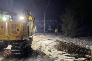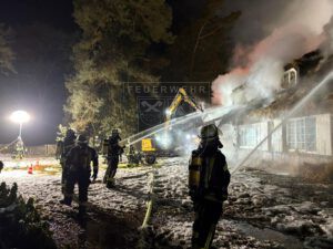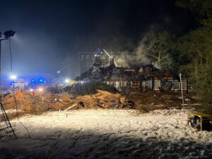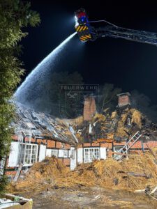Im weiteren Einsatzverlauf entwickelte sich ein Vollbrand des Dachstuhls, nachdem sich das Feuer unter dem Reet ausgebreitet hatte und eine Brandausbreitung nicht mehr verhindert werden konnte. Anschließend wurde das Gebäudedach mithilfe eines Baggers sowie eines Teleskopladers abgetragen, um Glutnester gezielt ablöschen zu können. Gegen 01:30 Uhr konnte schließlich „Feuer aus“ gemeldet und mit den Rückbauarbeiten begonnen werden. Insgesamt dauerte die Arbeiten für unsere Kräfte über 10 Stunden.