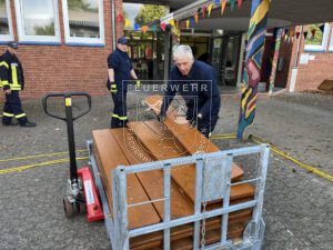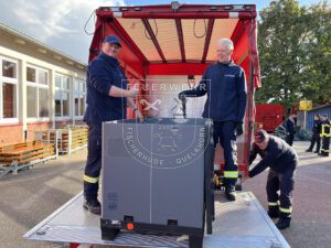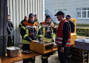 Während der zweitägigen Übung der Kreisfeuerwehrbereitschaft Verden im Landkreis Nienburg wurden mehrere, zum Teil dynamische Einsatzlagen, unter anderem ein Waldbrand sowie ein Zugunfall mit Gebäudeeinsturz, abgearbeitet. Wir sind Teil des Fachzuges Logistik und Versorgung und unsere Kamerad:innen trafen sich mit diesem am frühen Samstagmorgen am Rettungszentrum Nord in Achim. Dort wurden Materialien verladen und anschließend fuhr der gesamte Zug zur Grundschule Wechold in der Grafschaft Hoya.