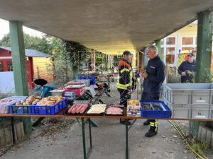 Vor Ort wurden der Küchencontainer sowie sämtliche Versorgungsleitungen errichtet und anschließend das Frühstück für die Einsatzkräfte vorbereitet. Neben der Verpflegung der Einsatzkräfte kümmerte sich unserer Zug zudem darum, dass jede:r einen vorbereiteten Schlafplatz in der der Turnhalle der Grundschule hatte. Außerdem wurden Sitzgelegenheiten aufgebaut, das Mittagessen zur Einsatzstelle gefahren und dort ausgegeben sowie alles gespült. Nach dem Abendessen wurde am Sonntag noch ein Frühstück zubereitet und anschließend wieder alles zurückgebaut.