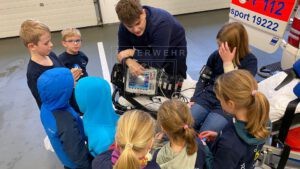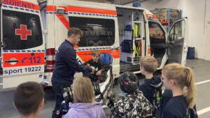 Ein weiteres Highlight war die Besichtigung eines Krankenwagens des DRK Ottersberg. Wer wollte, durfte auf der Rolltrage Platz nehmen und zudem wurde bei einigen Kindern der Puls, Blutdruck sowie die Sauerstoffsättigung gemessen. Ebenfalls wurde gezeigt, wie ein EKG geschrieben wird. An dieser Stelle nochmal ein Dankeschön an unseren Kameraden vom DRK, der sich auch sehr viel Zeit für die zahlreichen Fragen der Löschdinos genommen hat.