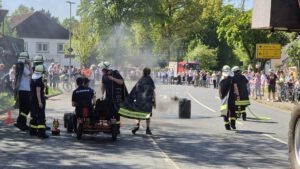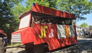 Wie jedes Jahr hat unsere Jugendfeuerwehr mit ihren gut gelaunten Jugendlichen und dem Wagen in der Optik eines Feuerwehrfahrzeuges am Festumzug teilgenommen. Unsere Aktiven haben sich auch dieses Jahr wieder voll ins Zeug gelegt und mit ihrem Wagen in der Optik einer Drehleiter und dem Motto „Lasst euch von Film und Sport nicht blenden, wir sind die Feuerwehr-Legenden“ den ersten Platz für die beste Performance aller teilnehmenden Wagen gewonnen. So haben sie unter anderem kleine Einsatzszenarien wie einen Mülleimerbrand oder einen Ast auf der Straße vorgeführt.