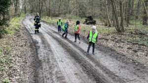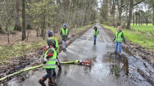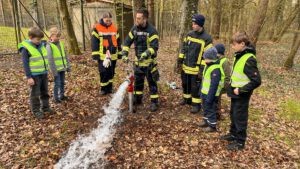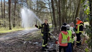 In der zweiten Station stand die Wasserentnahme aus einem Brunnen im Mittelpunkt. Hier lernten die Löschdinos den Unterschied zum Hydranten kennen. Während das Wasser beim Hydranten von selbst fließt, muss es beim Brunnen mithilfe einer Pumpe angesaugt werden. Auch hier erklärten die Betreuer den Aufbau sowie das Anschließen der Geräte und führten die Wasserentnahme praktisch vor. Besonders wichtig war die Erkenntnis, dass Brunnen vor allem dort eine große Rolle spielen, wo es keine Hydranten gibt. Beispielsweise in ländlichen Gebieten oder im Wald.
