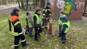 An einer Station drehte sich alles um die Hydrantenkunde. Unsere Löschdinos lernten die Unterschiede zwischen Unterflur- und Oberflurhydranten kennen und erfuhren, wie man einen Unterflurhydranten anhand eines Hydrantenschildes findet sowie die Bedeutung der dort angegebenen Zahlen. Dabei stand vor allem das Kennenlernen der Gerätschaften und Abläufe im Vordergrund. Das Setzen des Standrohres, das Öffnen und Spülen des Hydranten sowie das Anschließen der Schläuche und der Aufbau der Wasserentnahme wurden durch die Betreuer vorgeführt und erklärt. Die Kinder konnten die einzelnen Schritte beobachten und nachvollziehen und so ein erstes Verständnis für die Abläufe im Einsatz gewinnen. Auch die Funktion und der Einsatz einer Pumpe zur Druckregulierung wurden anschaulich erläutert. Beim Oberflurhydranten wurde ebenfalls gezeigt, wie schnell und einfach eine Wasserentnahme erfolgen kann und welche Handgriffe dafür notwendig sind.