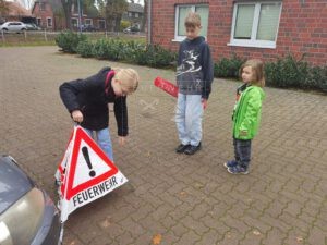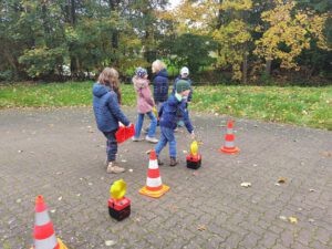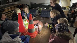 Nach einer kurzen theoretischen Einführung, warum und wie Einsatzstellen abgesichert werden, durften die Kinder ihr Wissen gleich praktisch anwenden. Hinter dem Feuerwehrhaus sperrten sie eine fiktive „Straße“ ab und stellten dabei fest, wie wichtig das richtige Absichern für die Sicherheit aller Beteiligten ist.