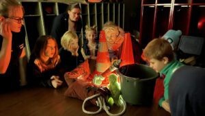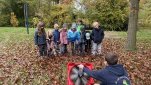An dieser Station befanden sich zwei Kuscheltier-Löschdinos an zwei unterschiedlichen „Einsatzorten“ mit verschiedenen Hindernissen. Aufgabe der Kinder war es, die Einsatzstellen mit einer Handlampe so auszuleuchten, dass die Dinos ohne Schattenwurf gut zu sehen waren. Dabei wurde schnell klar, dass nicht jede Position optimal und eine gute Kommunikation im Team entscheidend ist, um Hindernisse und Lichtverhältnisse gemeinsam zu meistern. Gemeinsam wurde auch überlegt, warum eine gute Beleuchtung im Einsatz so wichtig ist und welche Leuchtmittel und Geräte der Feuerwehr dafür zur Verfügung stehen.
