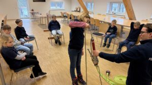 In einer Einheit Knoten und Stiche lernten die Löschdinos grundlegende Feuerwehrknoten kennen. Vor der Pause durften sie sich am Mastwurf, dem Kreuzknoten und dem Zimmermannsstich probieren, nachdem ihnen diese gezeigt worden waren. Nach einer kurzen Stärkung ging es mit weiteren Knoten weiter. Der doppelte Ankerstich und der Halbschlag wurden am Strahlrohr demonstriert und ausprobiert. Zudem wurde der Rettungsbund vorgeführt und alle bereits gelernten Knoten noch einmal wiederholt, sodass jedes Kind die Möglichkeit hatte, das Geübte zu festigen.