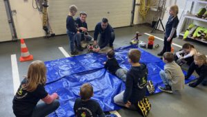 An einer weiteren Station ging es um die Gerätekunde. Verschiedene Geräte wurden zunächst unter einer Plane verborgen und nur für kurze Zeit aufgedeckt. Unsere Löschdinos sollten sich die Gegenstände merken und anschließend aus der Erinnerung benennen. Danach wurde ausführlich über Einsatzzweck und Funktionsweise gesprochen. Die Löschdinos zeigten dabei großes Interesse und stellten viele Fragen – ein schönes Zeichen dafür, wie neugierig und aufmerksam sie bei der Sache waren.