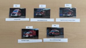 Anschließend durchliefen unsere Löschdinos in zwei Gruppen nacheinander die verschiedenen Stationen. In der Station Fahrzeugkunde beschäftigten sich die Kinder intensiv mit unseren Einsatzfahrzeugen. Gemeinsam wurden Abkürzungen, genaue Bezeichnungen, Funkrufnamen und die jeweilige Beladung besprochen. Um das frisch erworbene Wissen spielerisch zu festigen, gab es ein Memory-Spiel. Hier sollten die Löschdinos die Abkürzungen und Fahrzeugbezeichnungen den passenden Abbildungen zuordnen.
