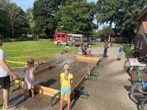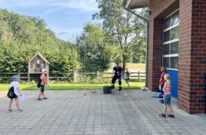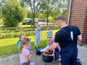 Aufgeteilt auf sechs Stationen haben die teilnehmenden Kinder Äpfel gefischt, Strahlrohr-Fußball gespielt, sich im Teebeutel-Weitwurf gegenseitig angefeuert oder Tennisbälle mithilfe einer Kübelspritze von Verkehrsleitkegeln geschossen. Ein weiteres Highlight war sicherlich das selbstgebaute kleine Feuerwehrauto mit Wasserkraft fortzubewegen oder Feuerwehr-Domino zu spielen.